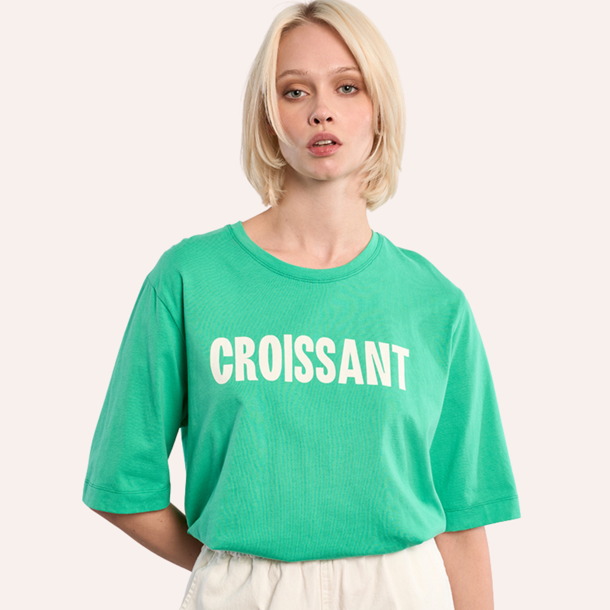 Why we picked it: Add a little fun to your everyday with this statement tee that doesn’t take itself too seriously. Featuring a bold “Croissant” graphic, this piece brings a playful, French-inspired twist to your off-duty wardrobe. Cut in a relaxed fit with a classic crew neckline, it’s made for easy, all-day wear. The soft, breathable fabric and vibrant colour options — fresh green or soft pink — make it an instant mood-booster, no matter your vibe.