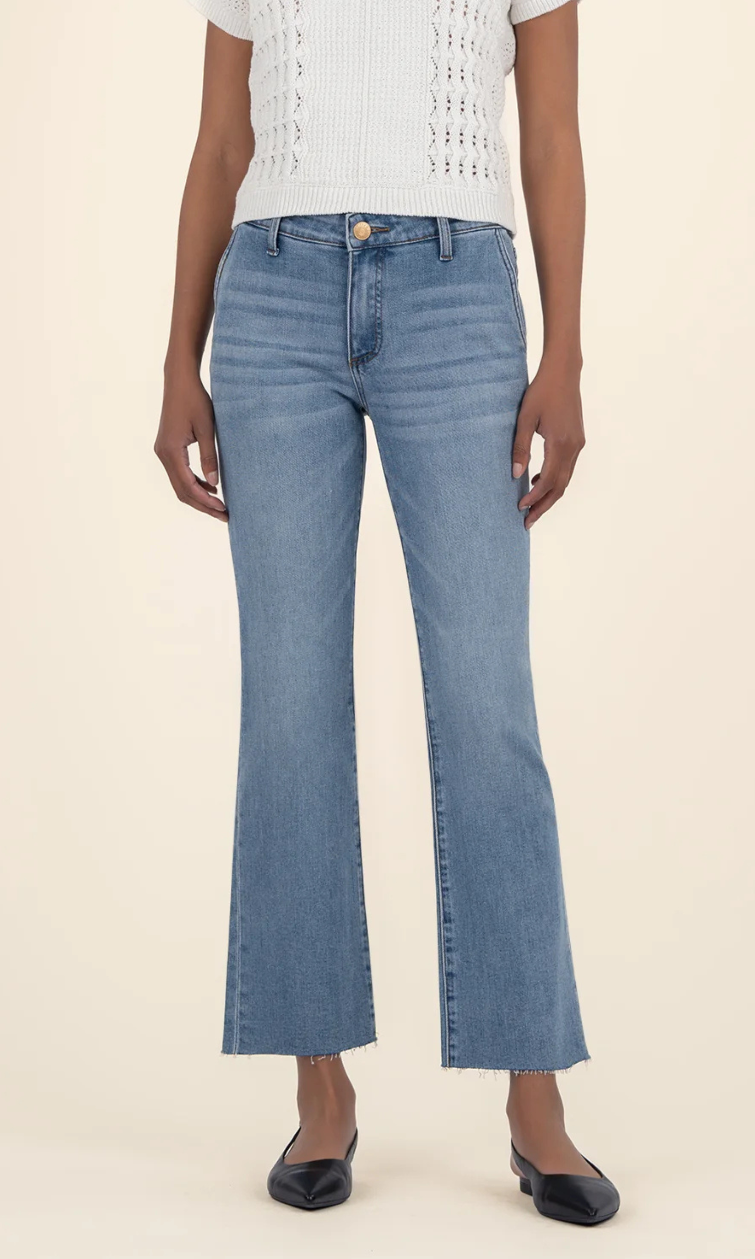 Why we picked it: This is a new style of Kelsey that we couldn't wait to add to our Kut collection. A medium wash with slash front pockets that give it a unique chino look. A raw hem gives it a little edge.