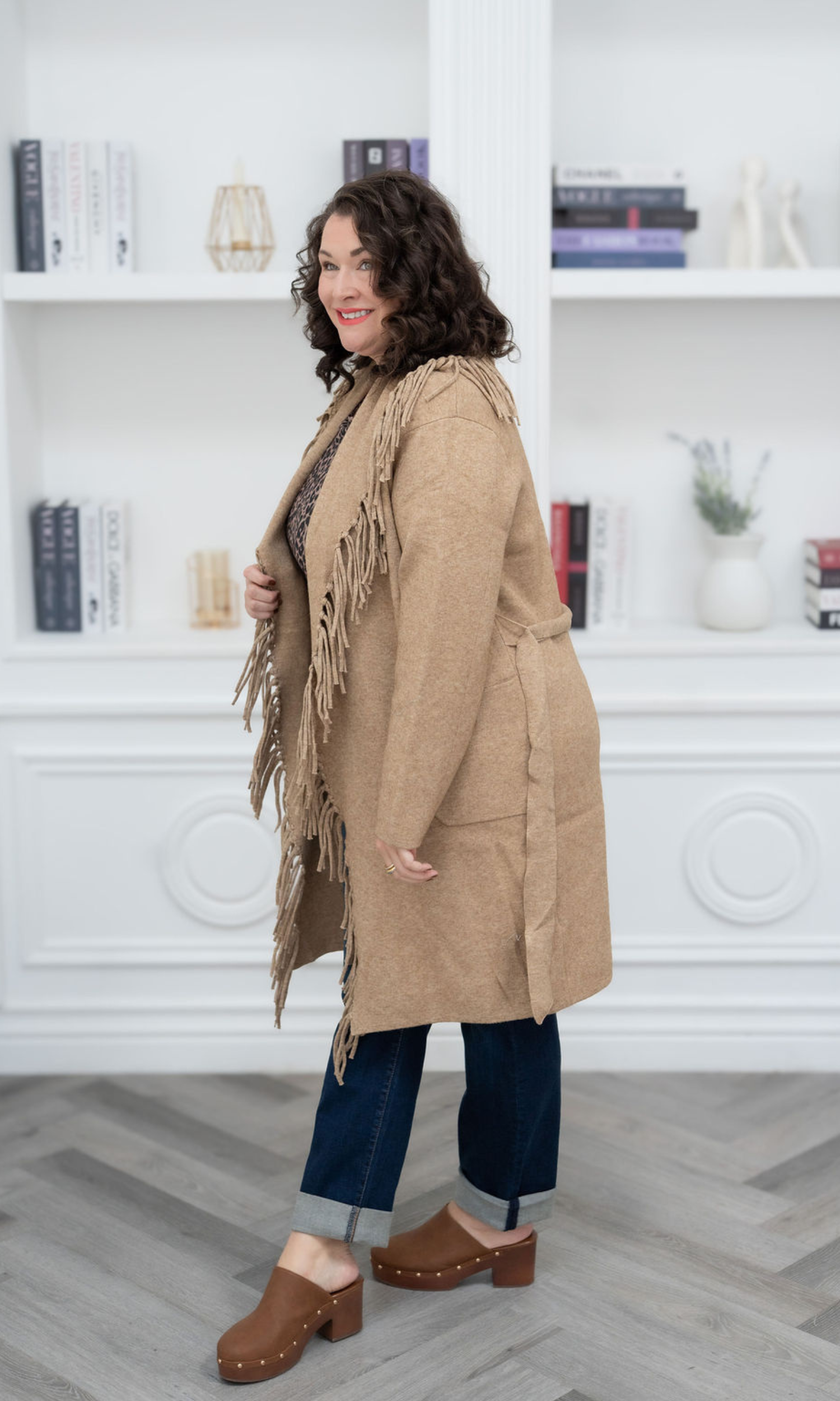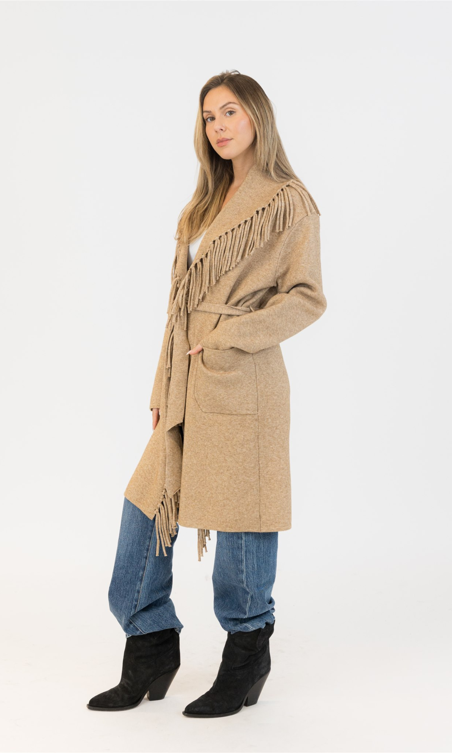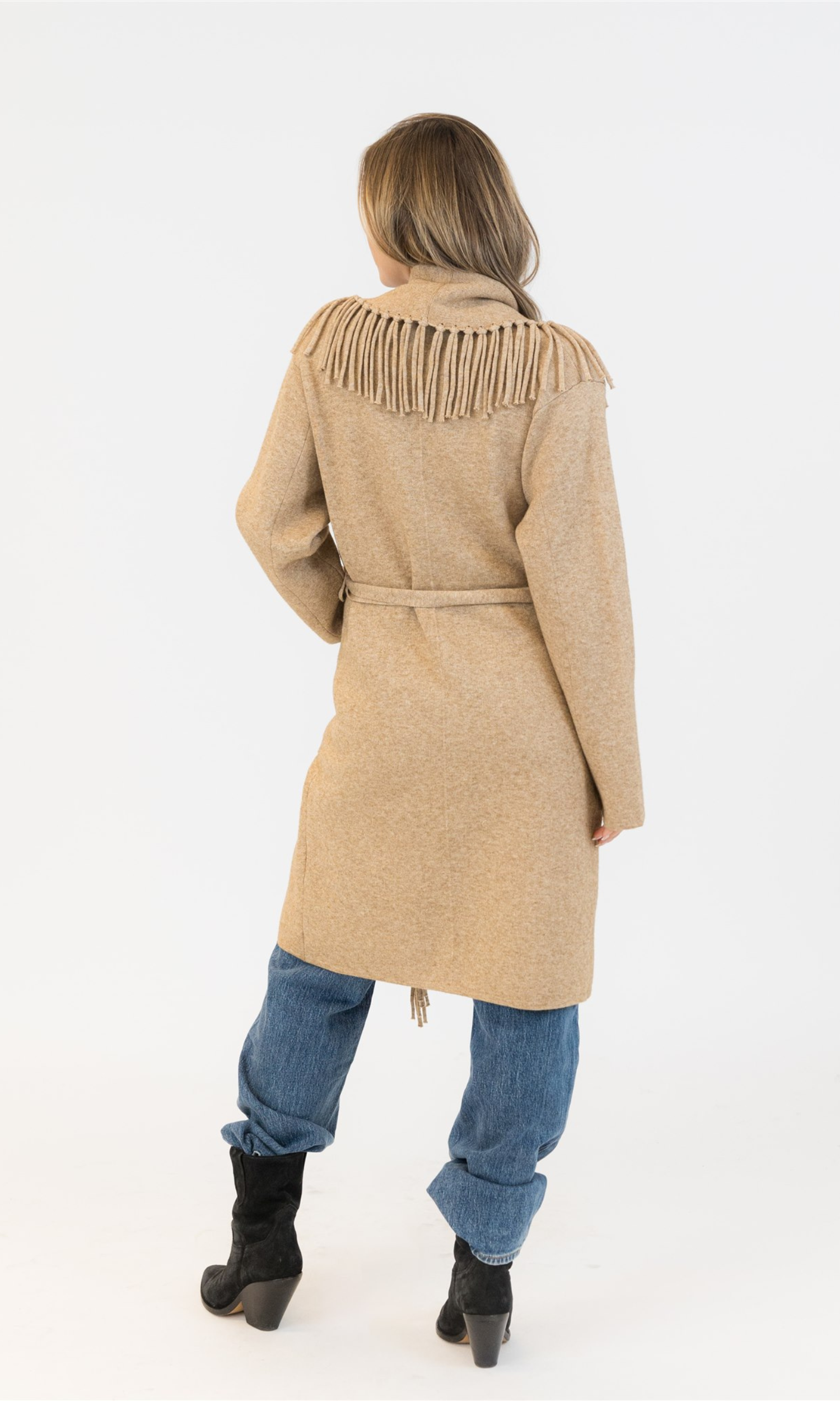 Fit: Ziggy has that perfect relaxed-but-intentional silhouette. Slightly oversized through the body for easy layering (yes, even over chunkier knits), while the structured shoulders keep it from feeling too slouchy. The open-front design lets you style it loose or belted—your call. The hem hits mid-thigh to just above the knee, depending on your height—ideal for elongating your frame and balancing proportions. And the fringe? It adds subtle movement and vertical interest. Hello, lengthened silhouette.